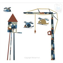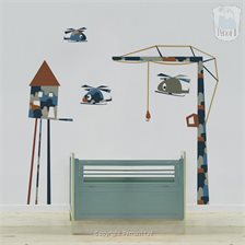 Met deze set van super grote muurstickers van een hijskraan, helikopters en een bouwkeet maak je een echt statement op de wand. Zo maak je in een handomdraai een stoere jongenskamer! Door het unieke materiaal dat wij gebruiken, zijn onze muurstickers heel makkelijk te plakken, blijven ze zeer goed zitten én zijn ze ook na verloop van tijd weer eenvoudig zonder lijmresten en beschadigingen aan de wand te verwijderen. Ook zijn ze makkelijk te plakken doordat ze uit verschillende losse onderdelen bestaan. Bovendien kun je zo de voorstelling naar eigen inzicht over de wand verdelen. De set is ontworpen om naast en boven een commode, wiegje of ledikantje te plaatsen zodat de voorstelling een hele wand beslaat. Maar je kunt de stickers natuurlijk ook over meerdere wanden verdelen! Laat je fantasie de vrije loop en maak je eigen compositie!